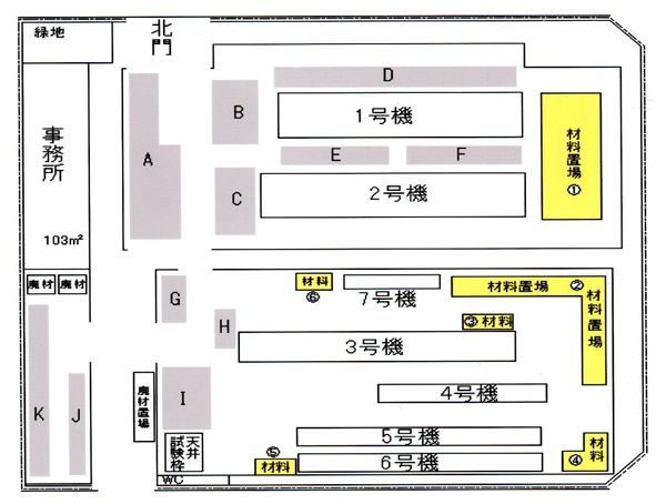(1) 1・2号機使用の材料置場 (2)(3) 3・4号機使用の材料置場 (4)(5) 4・5・6号機使用の材料置場 (6) 7号機使用の材料置場 A~I 製品置場 J~K ランナ一般材保管場所